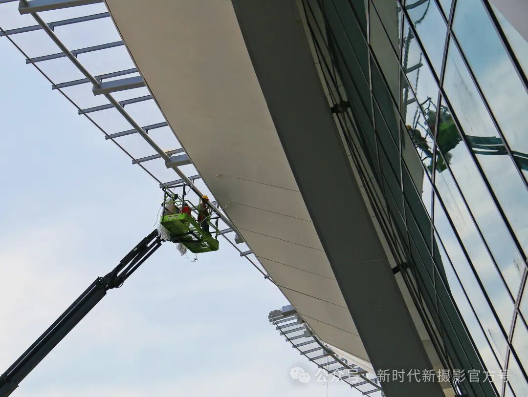 于2024年5月3日拍摄于亳州机场建设工地,照片反映的是工人正在进行航站楼外装饰施工作业。