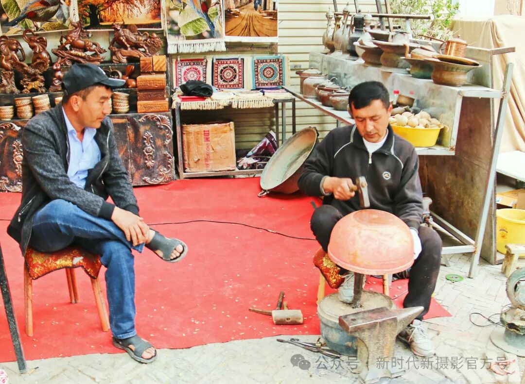 于2024年4月14日拍摄于新疆喀什古城,照片反映的是一位维吾尔族铜匠正在认真打造铜器。