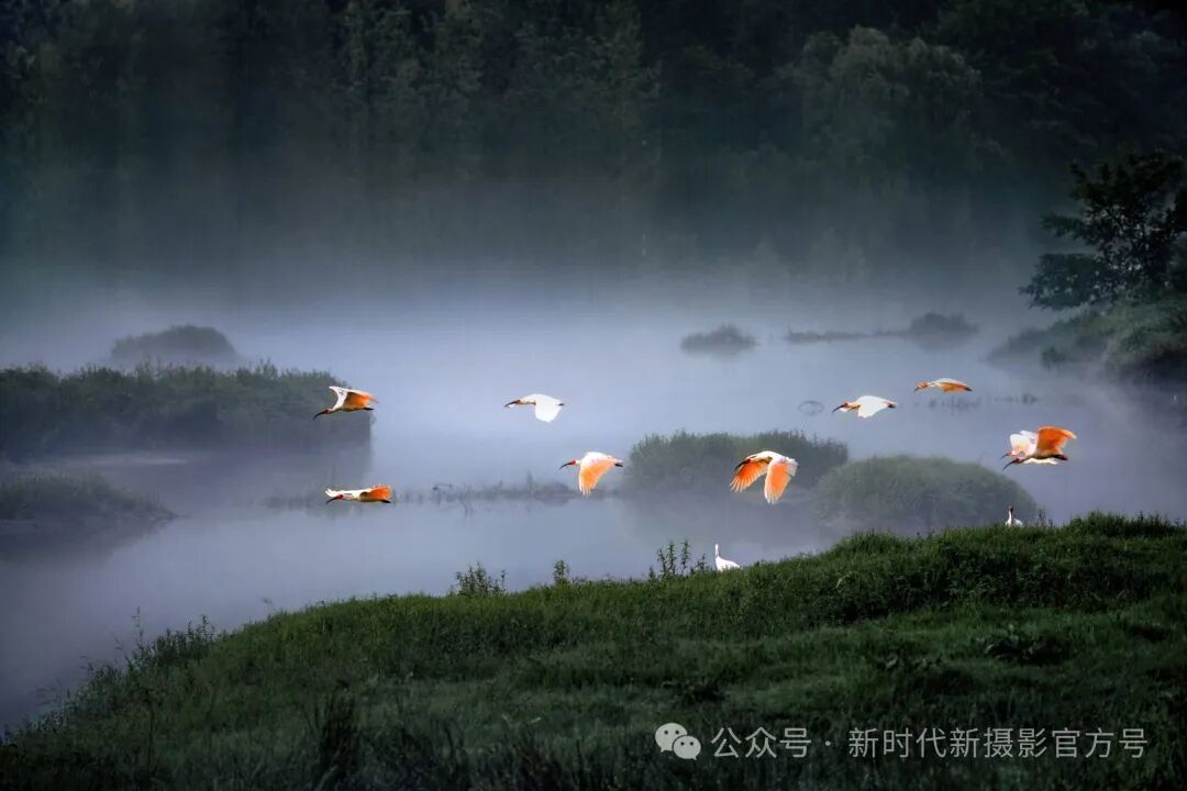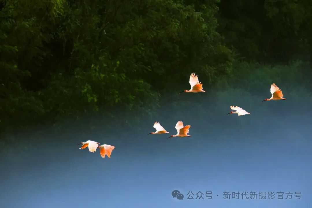首先,摄影师巧妙地捕捉到了两只秦岭朱鹮在晨雾中飞翔的瞬间,展现了它们的优雅身姿和矫健身法。同时,画面中的朱鹮与它们的倒影形成了一种对称美,不仅增添了画面的艺术感,也让人感受到了大自然的和谐与宁静。