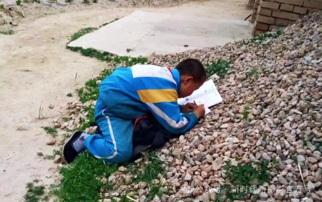 去村里路过的一幕,孩子放学回家,大人干农活还没回来,门锁着进不去,自觉在石堆上写作业。