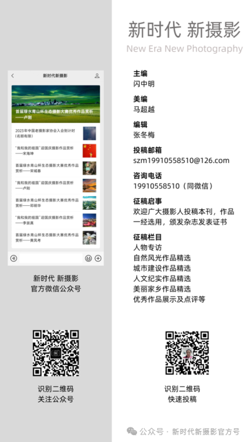 2. 图文说明:投稿图片应包含作品名称、作者姓名、手机号,图片说明(200字以内),以上资料发送至新时代新摄影编辑邮箱:szm19910558510@126.com,电话同微信:19910558510 闪编辑