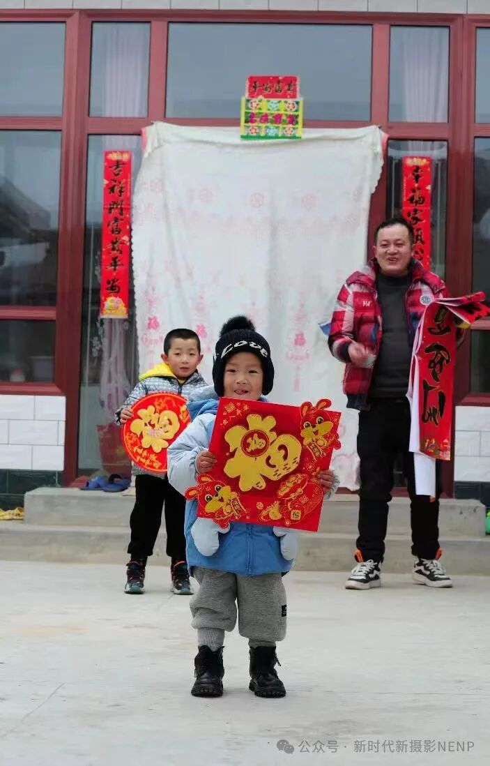 马青山的《福娃》这张摄影作品巧妙地捕捉了中国春节的喜庆和家庭团聚的氛围。图片中的小男孩手持“福”字春联,象征着新年的祝福和好运,为整个场景增添了浓厚的节日气息。他身后的两个年幼孩子,手持春联和大红福字,不仅展现了孩子们的天真烂漫,也体现了中国传统文化的传承。