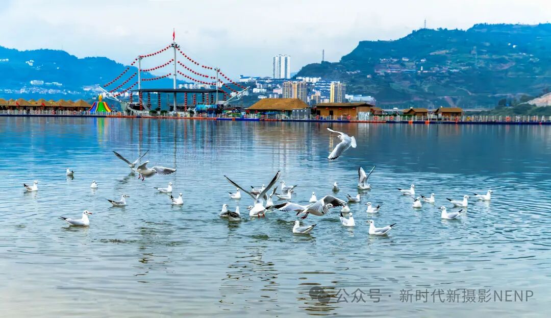 2022年11月6日,市民正在围观金沙江上自由嬉戏的红嘴鸥。 曾三东/摄