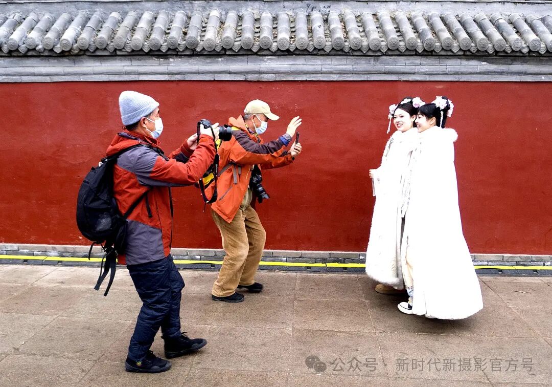 两位老摄影爱好者为清朝装扮的少女拍摄。