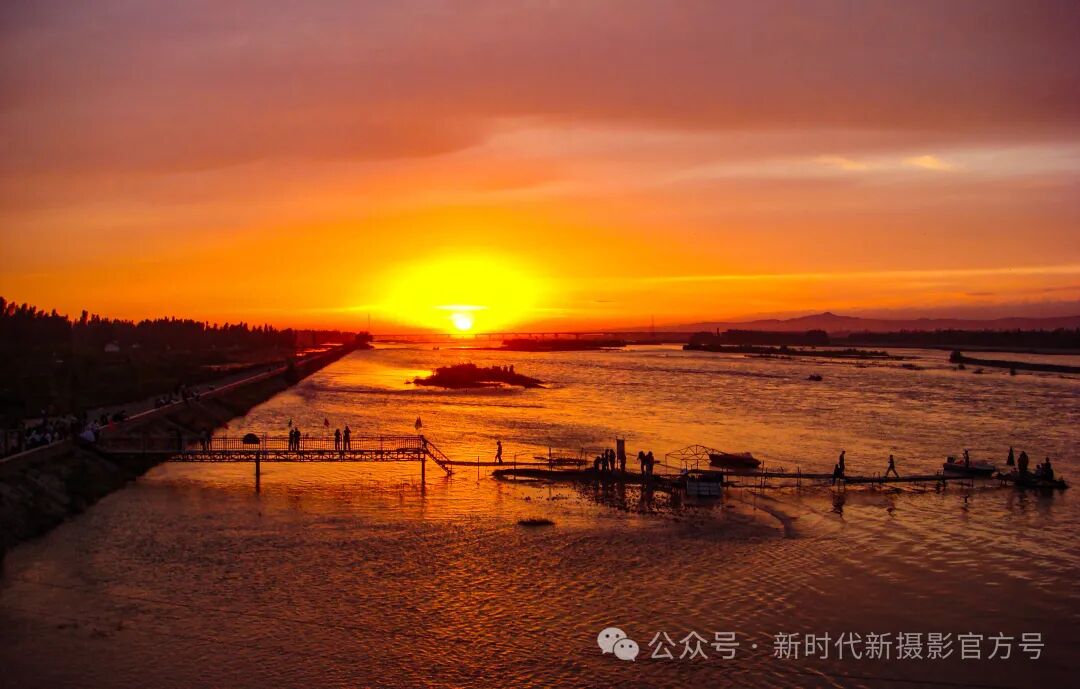 画面构图精妙,夕阳余晖与河流宁静交融,橙红交织的天空映照在波光粼粼的水面,美不胜收。远山轮廓若隐若现,增添了神秘与宁静。
