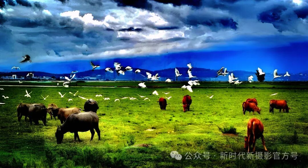 杨绍勇老师的《和谐环境悠然自在》这张作品以广阔的草原为主题,展现了一幅宁静和谐的自然画卷。天空中白云悠悠,鸟儿飞翔,为画面增添了几分生动与活力。