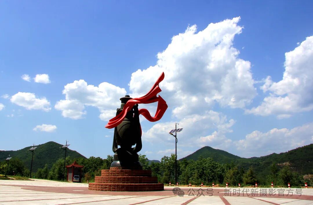 画面中,雕塑的细节处理精致,红色丝带的飘动感为画面增添了动态之美。背景山丘与天空拓展了画面空间,使作品层次分明、立体感强。