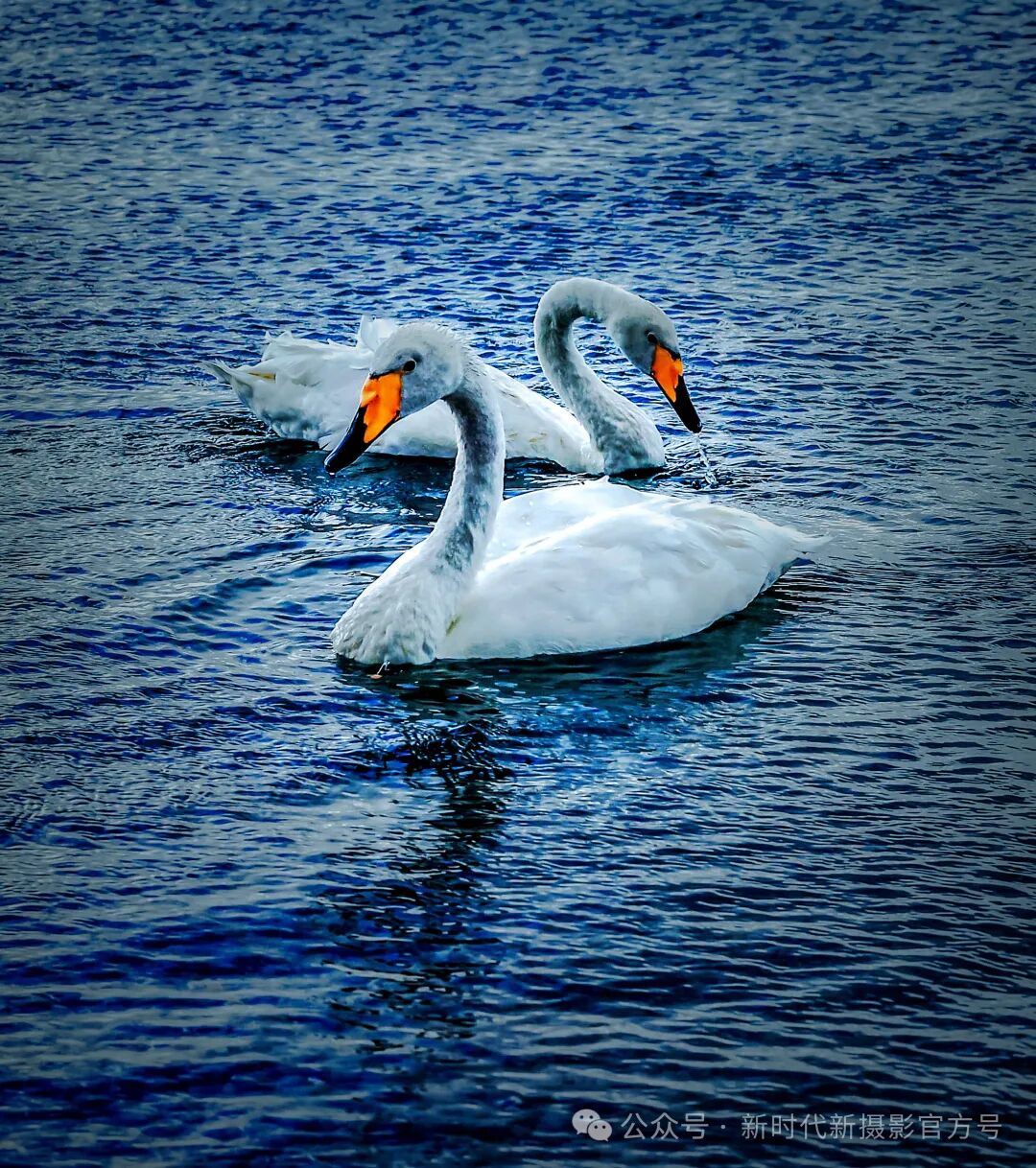 在蓝色赛里木湖上,悠闲的天鹅在戏水游玩,在湖中摆出各种优美的造型,让人赏心悦目。