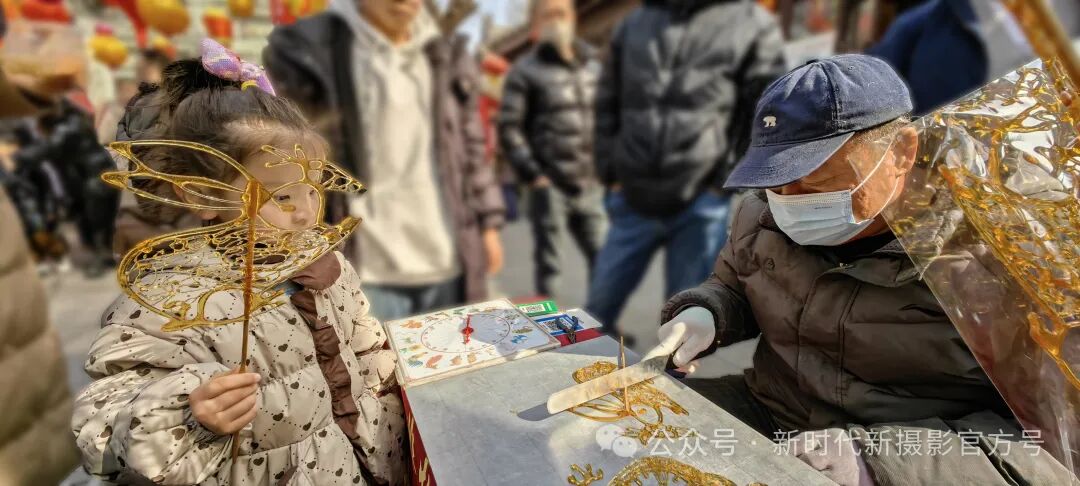 拍摄2024年2月24日天津西青区杨柳青古镇,孩子正在品尝非遗糖人。