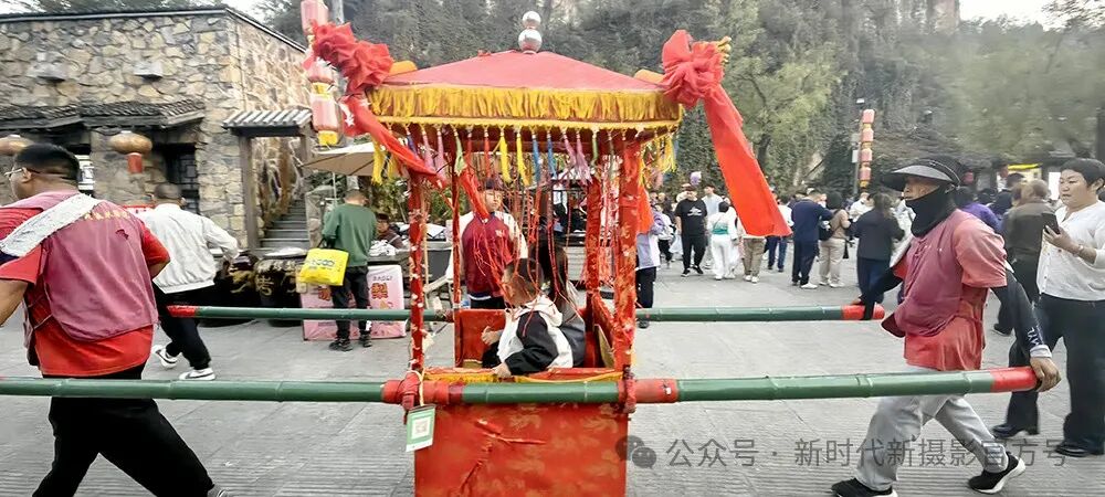 拍摄2024年10月4日河北省保定太行水镇,展示30年代抬轿子的场景。