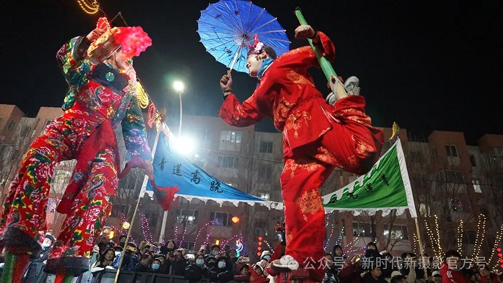 拍摄2024年2月25日天津葛沽镇庙会,非遗单推高跷表演。