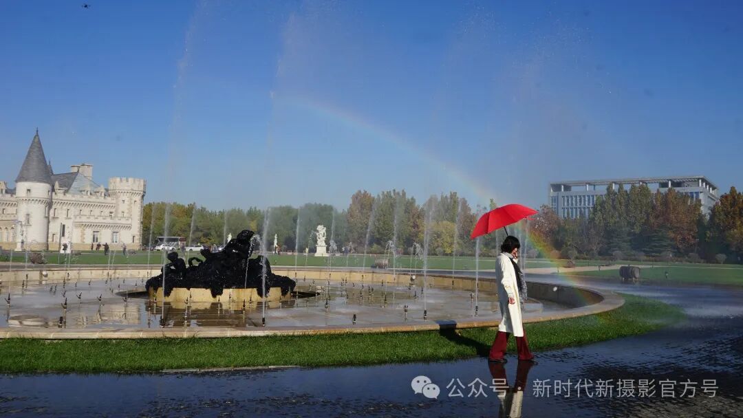 拍摄2024年11月5日天津北辰王朝酒堡总部,一位游客彩虹下雨中情驶过。