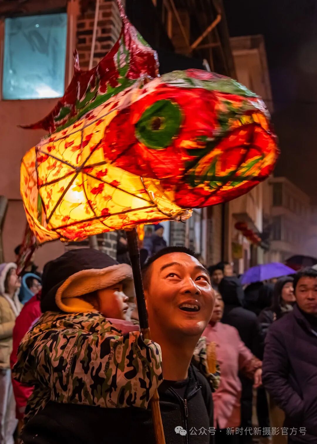 2023年2月5日,农历正月十五,安徽省歙县溪头镇汪满田村 ,举办了元宵节鱼灯会。灯会上的父子俩,孩子举着鱼灯,父亲露出久违的笑容。