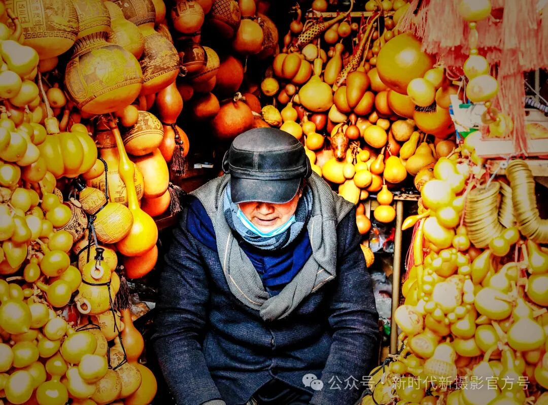 图中老人守护着葫芦店,在他周围各种大小葫芦,呈现了一种奇妙的色彩感和构图感,给人以赏心悦目之感。