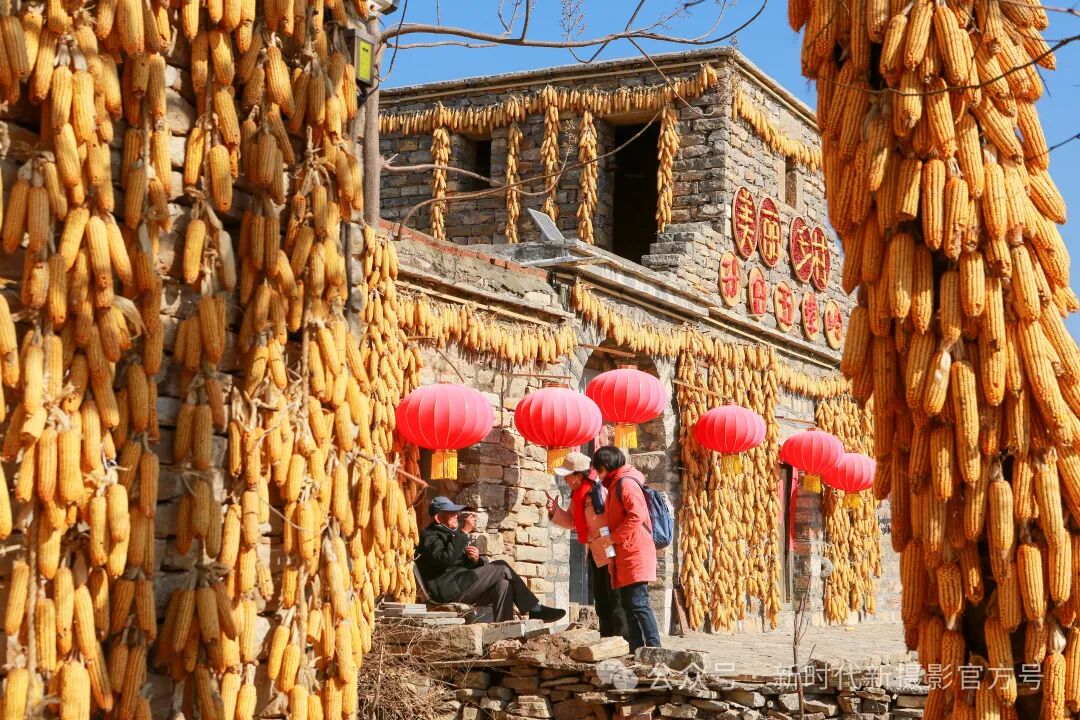 走进村子,脚下是蜿蜒曲折的石头路,身旁是古朴厚重的石头屋,而石头垒砌的墙上、古树上,挂满了金色的玉米,与点缀其中的大红灯笼相互映衬,构成了一幅独特的乡村晒秋图,给人一种炫目的视觉效果,仿佛瞬间穿越回了过去的岁月。