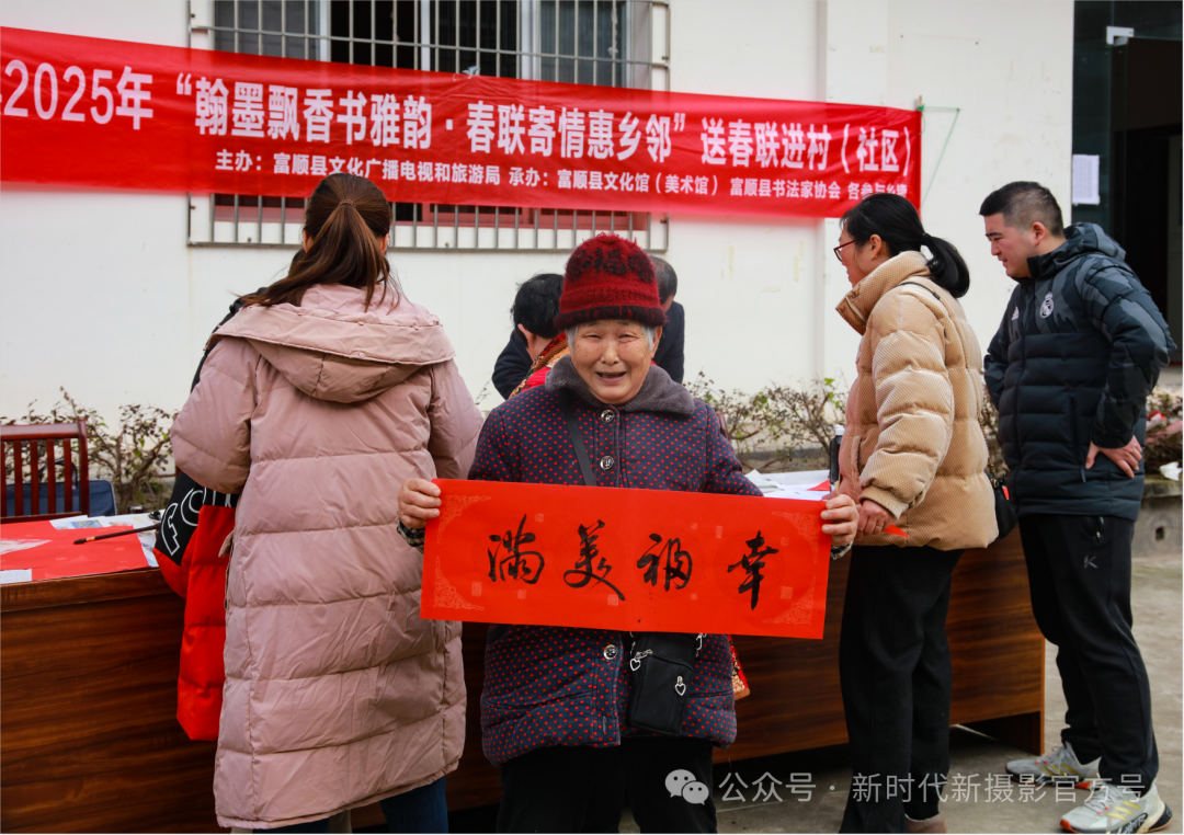 2025.1.16春节前夕,四川省自贡市富顺县兜山镇铁山村的陈婆婆在家门口得到了一幅县书法家协会的老师书写惠赠的春联,喜笑颜开。