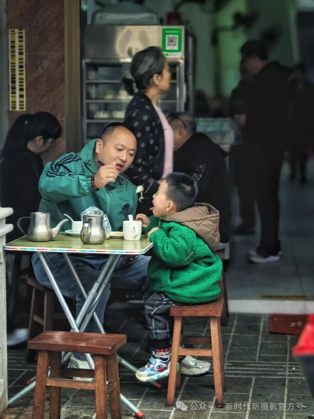 海口骑楼老街上,父亲给儿子夹取食物,画面温馨,羡煞旁人。