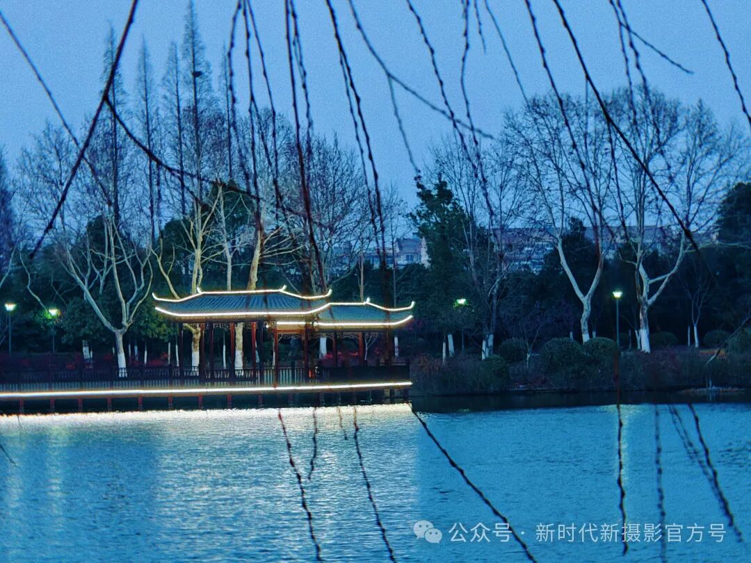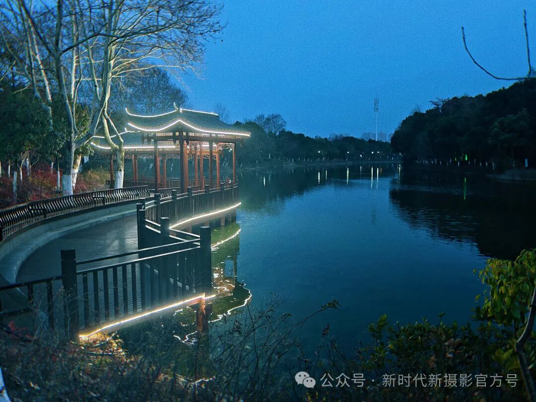 当夜幕悄然降临,深蓝的天空下,湖水如镜般平静。沿湖的木质步道蜿蜒曲折,被柔和的灯光勾勒出优美的线条。古雅的亭廊在光影中若影若现,远处一座中式凉亭被暖黄色灯光勾勒出优美的轮廓,在暗色背景中显得格外温馨。整个画面静谧而迷人,仿佛是喧嚣城市中的一处清幽之地 。