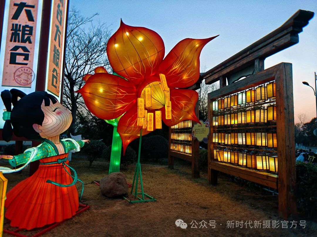 暮色渐临,大粮仓旁,身着古装的萌娃花灯俏皮可爱,似在伸手探寻。一旁巨大的橙红花形花灯璀璨夺目,散发着温暖光芒。木架上排列的小灯闪烁,营造出梦幻氛围,尽显古镇夜灯的独特意趣 。