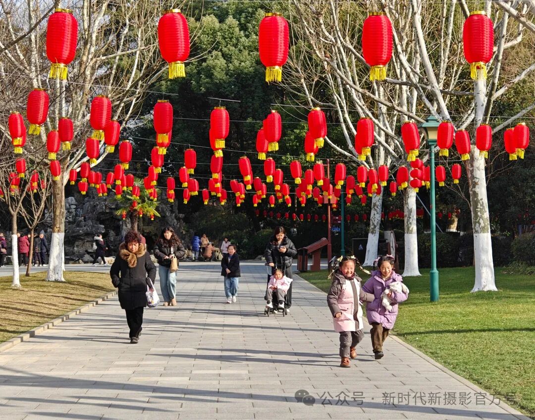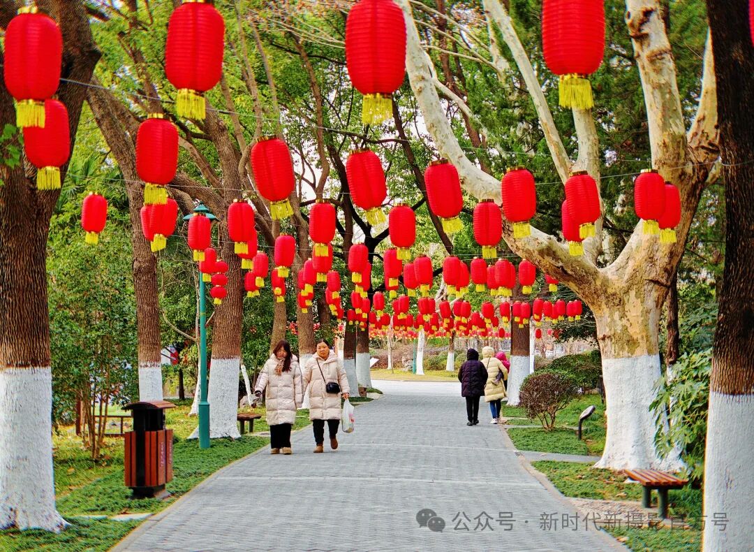 正月初八,公园里红彤灯笼如串串火焰,悬于灰白树干间,下方小径上,行人悠然漫步,孩童嬉笑追逐 。阳光洒落,映照出一片祥和且充满生机的节日景象,洋溢着浓浓的春节节日氛围。