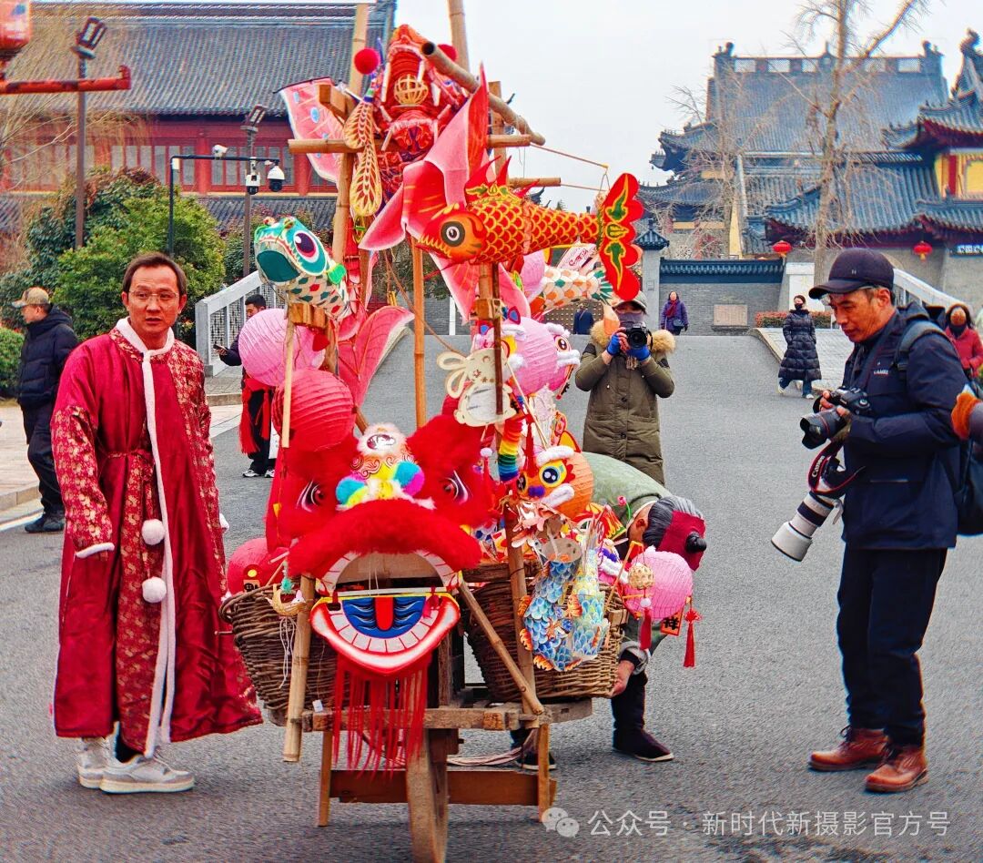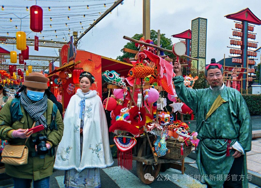 古街深处,一位身着红衣的货郎静立,身旁推车挂满五彩花灯,鱼形、狮头造型栩栩如生。一旁摄影师专注取景,时光仿佛在此刻凝固,尽显古镇的传统韵味与人文风情 。