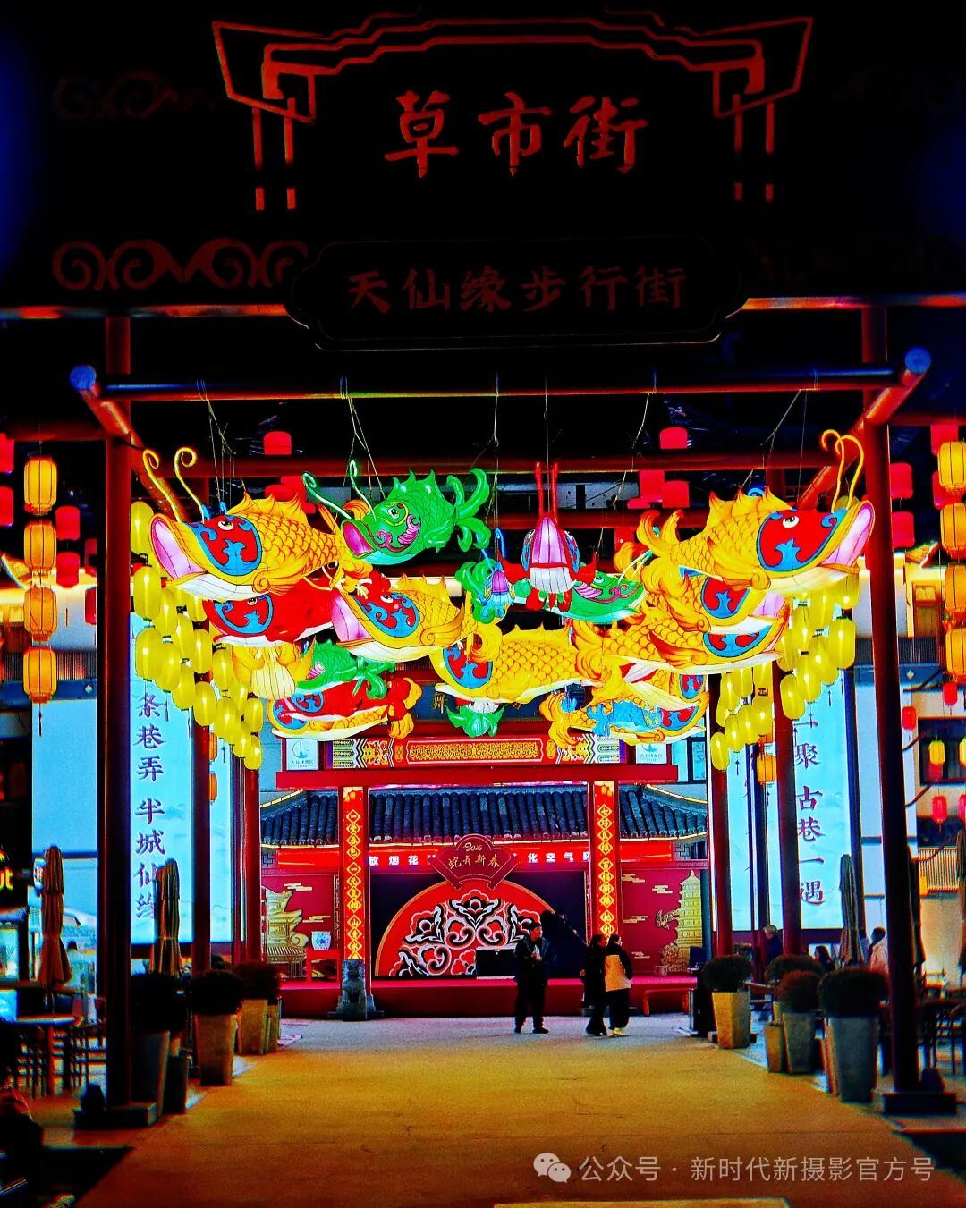 草市街的牌坊下,五彩斑斓的鱼形花灯高高悬挂,仿若灵动游弋。天仙缘步行街的背景里,红墙黑瓦与古韵楹联相映成趣,行人在光影中穿梭,洋溢着浓郁的节日氛围与浪漫的仙缘意趣 。