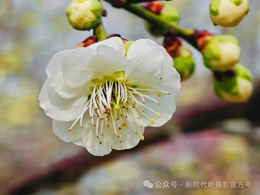 枝头上,一朵素白的梅花悄然绽放,花瓣纯净如雪,细长的花蕊吐露着点点金黄。周围簇拥着尚未开放的青绿色花苞,带着一丝羞涩与期待,仿佛在静静地诉说着属于自己的故事。