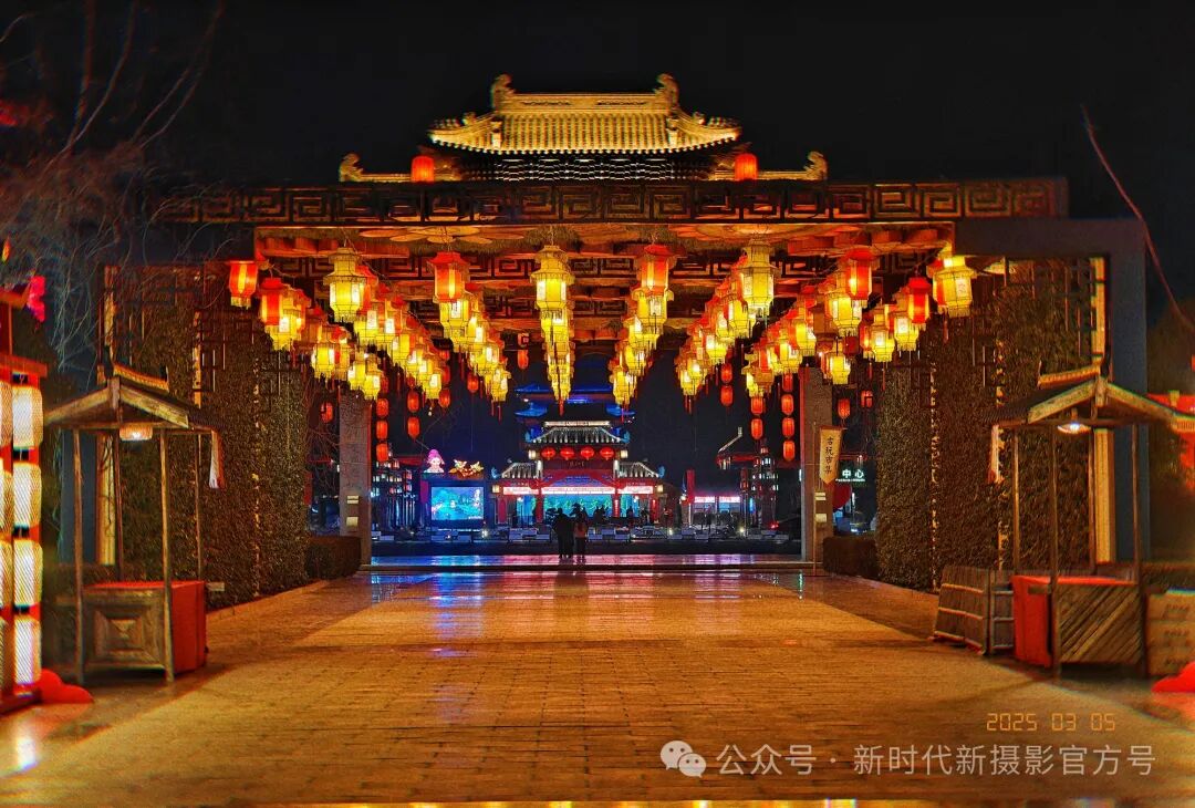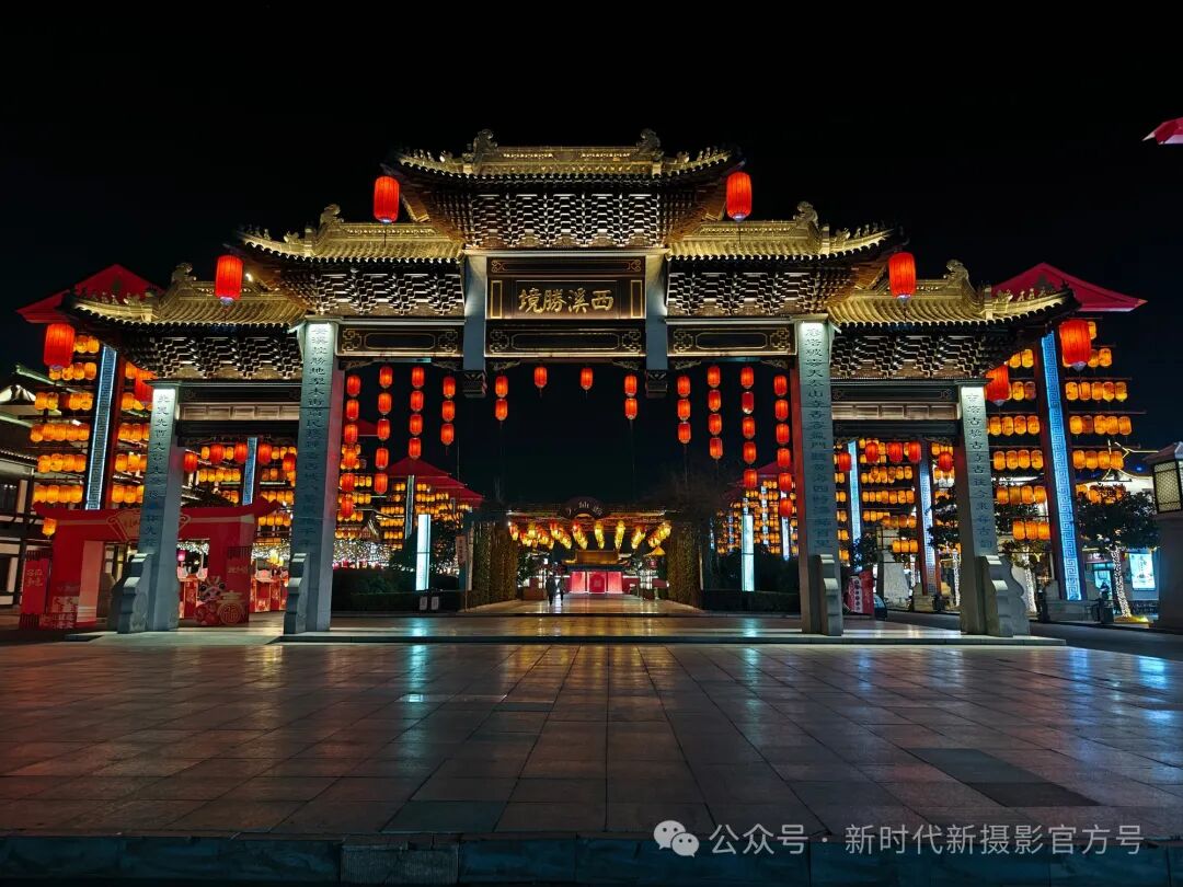 元宵佳节,“西溪胜境”夜色如墨,牌坊在五彩灯光的勾勒下熠熠生辉,大红的灯笼高高悬挂,散发着浓郁的节日氛围。牌坊下宽敞的步道延伸向远方,隐隐可见更深处的璀璨灯火,尽显古镇夜晚的繁华与古韵 。
