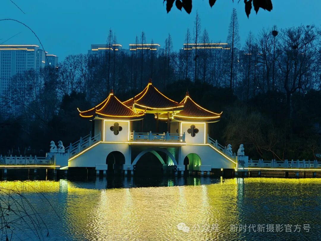 夜幕低垂,公园里湖面上一座古亭三亭桥,在灯光映照下熠熠生辉。橙红的亭顶与白色的亭身,搭配着暖黄灯光,轮廓优美。亭下拱桥横跨湖面,灯光洒在水面,泛起粼粼金光。远处林立的高楼与枯树,增添了画面的层次感,营造出静谧而迷人的氛围 。