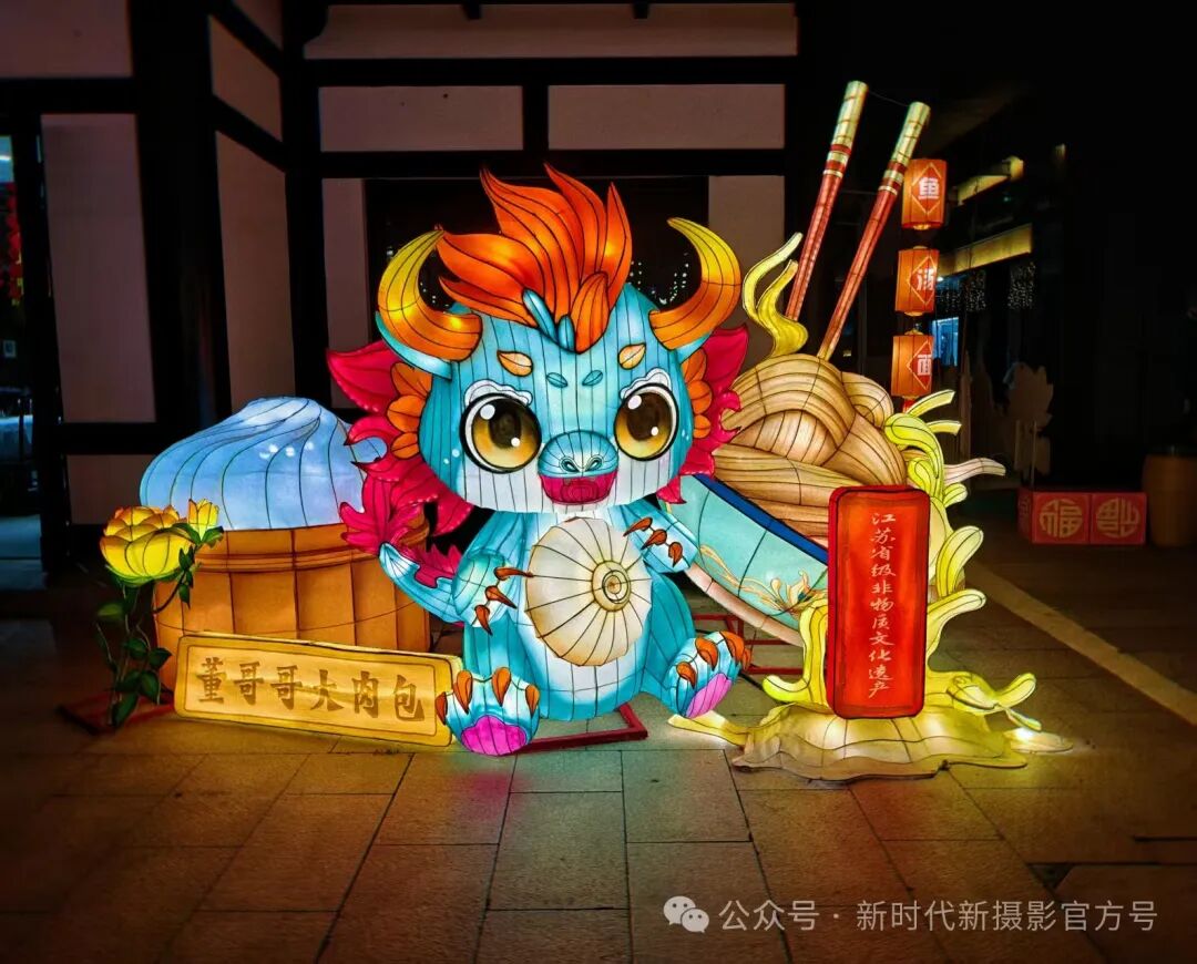 画面中,一只色彩绚丽的萌态小龙花灯居于中心,橙红色鬃毛飞扬,大眼睛透着灵动。它身旁围绕着极具特色的元素,如大大的肉包造型、面条和筷子,旁边还配有“董哥哥大肉包”和“江苏省级非物质文化遗产”字样个 。背景是古色古香的建筑,整个场景将可爱的卡通形象与地方非遗美食文化巧妙融合,在灯光映照下,既充满童趣,又散发着浓厚的传统文化氛围 。