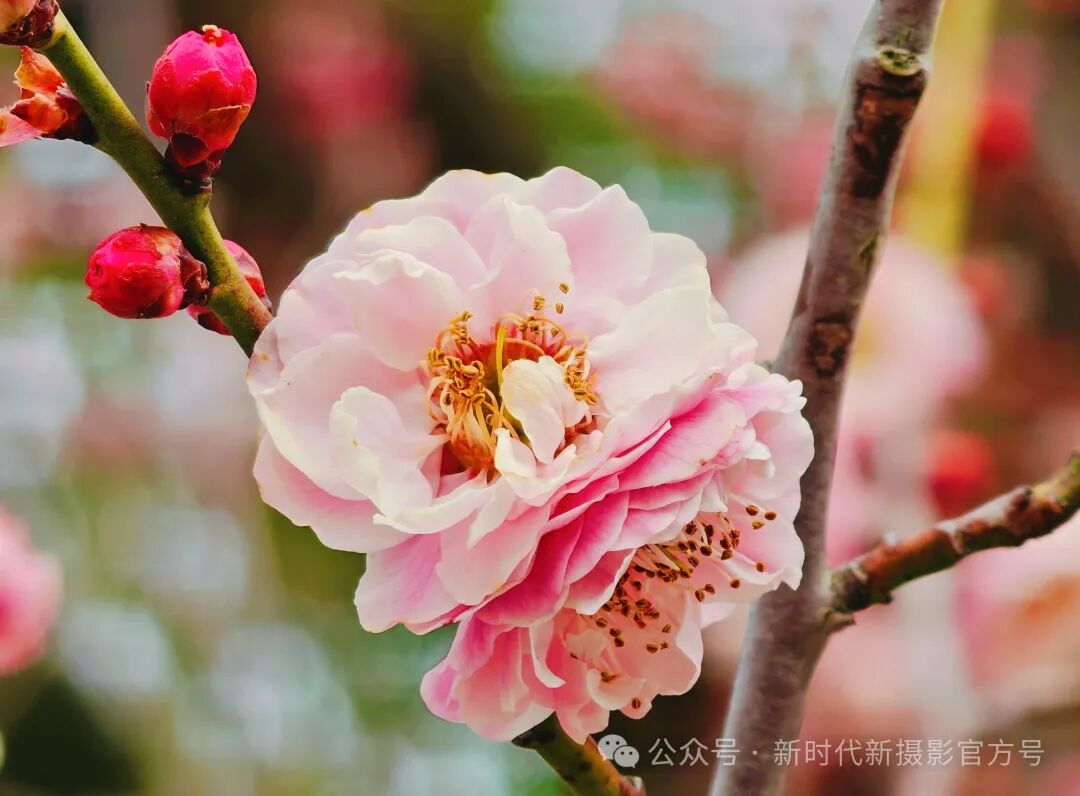 水边,遒劲的梅树枝干上,缀满娇艳的粉色花朵,如繁星点点。曲折的木廊依水而建,深色的栏杆与木板透着古朴韵味。廊的后方,是黛瓦覆顶的建筑,隐隐约约。水面如镜,将梅、廊、建筑一一倒映,虚实相生。微风拂过,能闻到空气中弥漫的淡淡梅香,整个画面宛如一幅古典的山水画卷 。