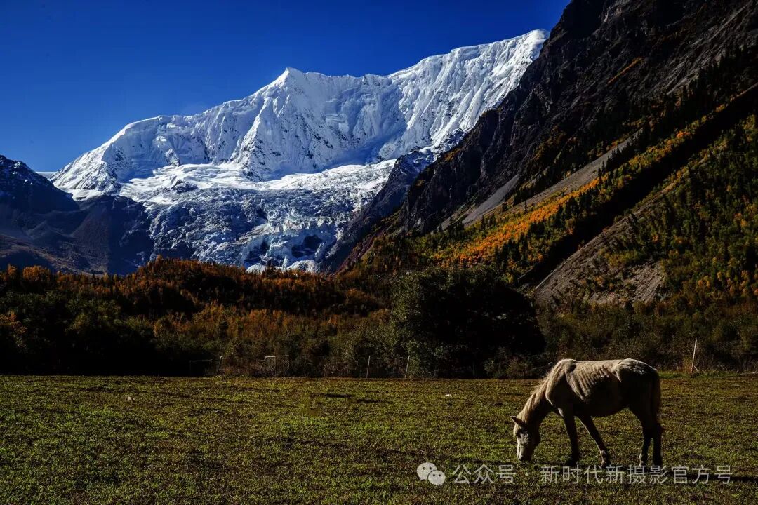 田斌老师的《静怡的冰川》这幅摄影作品令人叹为观止。画面中,马在绿草地上悠闲吃草,与背景巍峨的雪山和层叠的冰川形成鲜明对比,展现出大自然的壮丽。蓝天与白雪交相辉映,纯净而宁静。