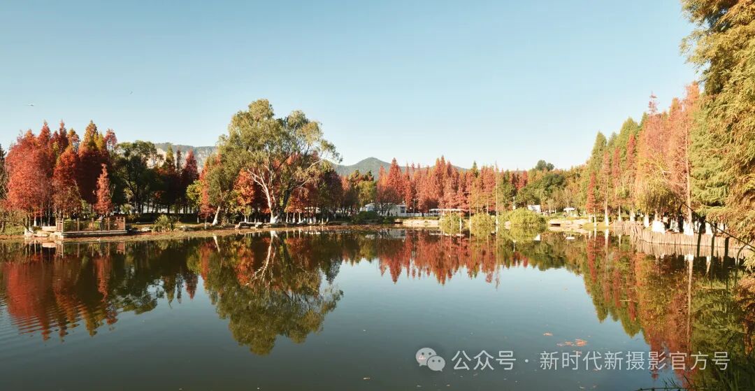 画面中,水杉树叶的红艳与周围绿树的沉静形成鲜明对比,色彩层次丰富,给人以强烈的视觉冲击。水面如镜,树影倒映其中,不仅增强了画面的层次感,也赋予了其一种静谧之美。