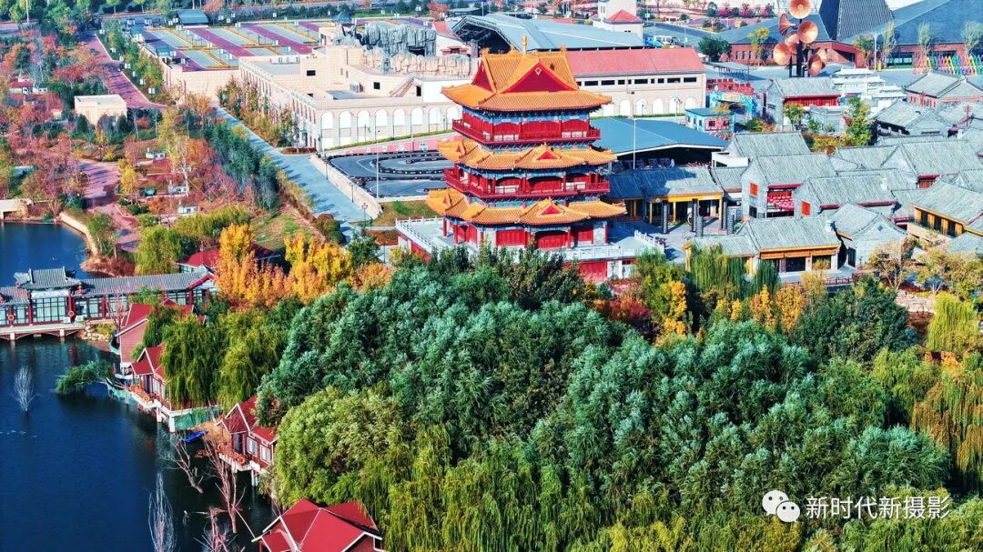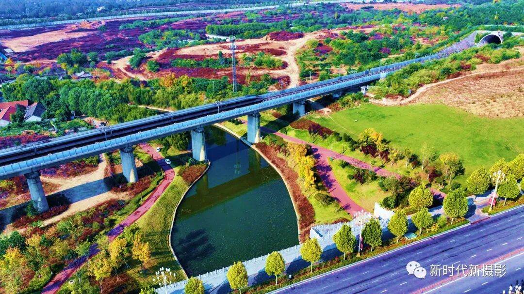 11月2日,山东省泰安市陡山河公园在航拍视角下,五彩斑斓的植物交叠呈现,层林微染,处处洋溢着秋的神韵。石拱桥,亭台楼阁,仿古长廊,雕梁画栋以及频频穿行于此的高铁,完全浸没在这片艳丽多彩的秋色中,眼前尽是油画一般的风光,不得不让人沉醉其中。