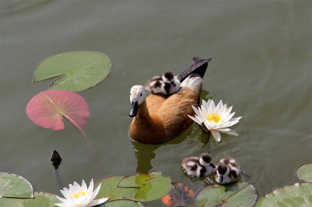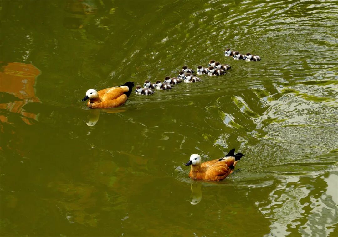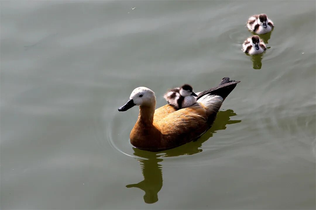 《赤麻鸭带宝宝湖中游》